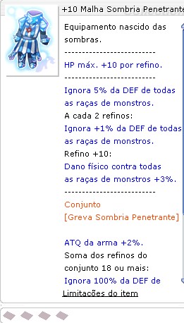 -------------------------- HP máx. +10 por refino. -------------------------- Ignora 5% da DEF de todas as raças de monstros. A cada 2 refinos: Ignora +1% da DEF de todas as raças de monstros. Refino +10 ou mais: Dano físico contra todas as raças de monstros +3%. -------------------------- Conjunto [Greva Sombria Penetrante] ATQ da arma +2%. Soma dos refinos do conjunto 18 ou mais: Ignora 100% da DEF de todas as raças de monstros. --------------------------