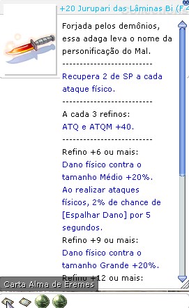 Tipo:Adaga ATQ:165ATQM:0 Peso:65 Nível da arma:4 Nível necessário:100 Classes:Superaprendizes, Espadachins, Arqueiros, Gatunos, Mercadores, Ninjas, Magos, Espiritualistas e evoluções