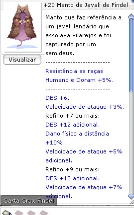 Manto que faz referência a um javali lendário que assolava vilarejos e foi capturado por um semideus. -------------------------- Resistência as raças Humano e Doram +5%. -------------------------- DES +6. Velocidade de ataque +3%. Refino +7 ou mais: DES +12 adicional. Dano físico a distância +10%. Velocidade de ataque +5% adicional. Refino +9 ou mais: DES +12 adicional. Velocidade de ataque +7% adicional. Dano físico a distância +10% adicional. -------------------------- Ao aprender [Montaria em Worg] nv.3: HP máx. +10.000. -------------------------- A cada nível de [Disparo Certeiro]: Dano físico contra todos os Tamanhos +2%. -------------------------- Ao aprender [Ilimitar] nv.5: Recarga de [Tempestade de Flechas] -0,3 segundos. -------------------------- Ao aprender [Armadilha Energizada] nv.5: Resistência a propriedade Fogo +100%. -------------------------- Tipo: Capa DEF: 12 DEFM: 0 Peso: 10 Nível necessário: 100 Classes: Todas