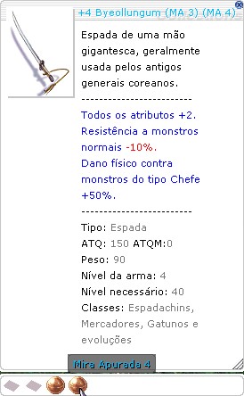 Tipo:Espada ATQ:150ATQM:0 Peso:90 Nível da arma:4 Nível necessário:40 Classes:Espadachins, Mercadores, Gatunos e evoluções