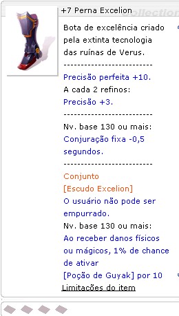 Nv. base 130 ou mais: Conjuração fixa -0,5 segundos. -------------------------- Conjunto [Escudo Excelion] O usuário não pode ser empurrado. Nv. base 130 ou mais: Ao receber danos físicos ou mágicos, 1% de chance de ativar [Poção de Guyak] por 10 segundos. -------------------------- Poção de Guyak Dobra a velocidade de movimento. --------------------------