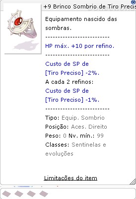 -------------------------- HP máx. +10 por refino. -------------------------- Custo de SP de [Tiro Preciso] -2%. A cada 2 refinos: Custo de SP de [Tiro Preciso] -1%. --------------------------