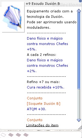 Equipamento criado com a tecnologia da Ilusión. Pode ser aprimorado usando moduladores. -------------------------- Dano físico e mágico contra monstros Chefes +5%. A cada 2 refinos: Dano físico e mágico contra monstros Chefes +2%. -------------------------- Refino +7 ou mais: Cura recebida +10%. -------------------------- Conjunto [Soquete Ilusión B] ATQM +30. -------------------------- Conjunto [Turbina Ilusión B] ATQ +30. -------------------------- Tipo: Escudo DEF: 20 DEFM: 0 Peso: 50 Nível necessário: 130 Classes: Todas |