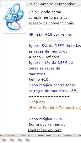 -------------------------- HP máx. +10 por refino. -------------------------- Ignora 5% da DEFM de todas as raças de monstros. A cada 2 refinos: Ignora +1% da DEFM de todas as raças de monstros. Refino +10 ou mais: Dano mágico contra todas as raças de monstros +3%. -------------------------- Conjunto [Brinco Sombrio Tempestivo] Dano mágico +2%. Soma dos refinos do conjunto 18 ou mais: Ignora 100% da DEFM de todas as raças de monstros. --------------------------
