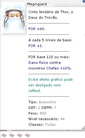 Cinto lendário de Thor, o Deus do Trovão. Amplia a força de quem o usa. FOR +40, DEFM +7 O Atributo FOR aumenta proporcionalmente ao level de base do usuário. Caso se tenha FOR base 120 ou maior, adiciona +10% de dano em monstros do tipo Chefe. Classe: Acessório Defesa: 2 Peso: 800 Nível necessário: 94 Classes que utilizam: Todas