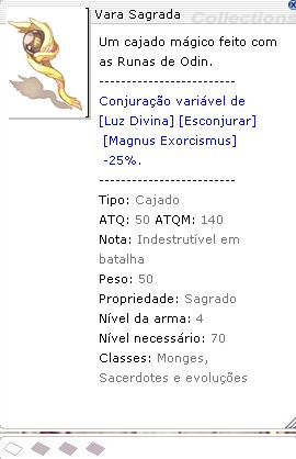 Um cajado mágico feito com as Runas de Odin. Indestrutível em batalha. Conjuração variável de [Luz Divina] [Esconjurar] [Magnus Exorcismus] -25%. Tipo:Cajado ATQ:50ATQM:140 Peso:50 Propriedade:Sagrado Nível da arma:4 Nível necessário:70 Classes:Sacerdotes, Monges e evoluções